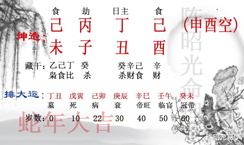 坤造:己未,丙子,丁丑,己酉(申酉空)