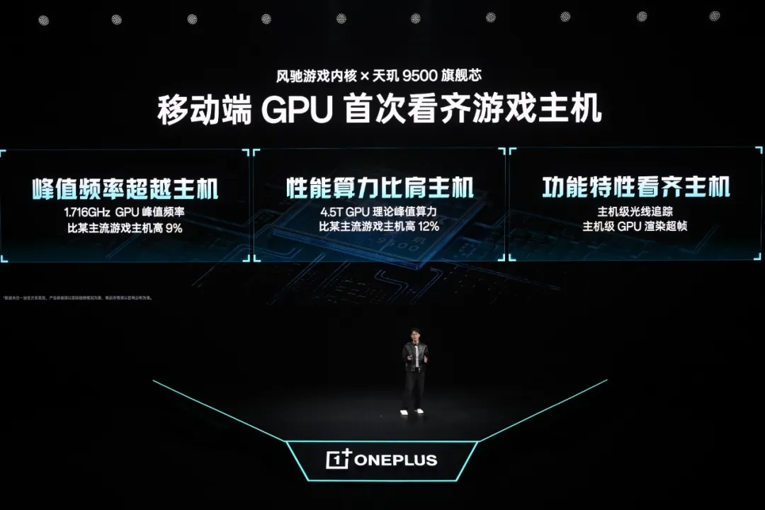 一加Ace 6至尊版出厂写入一加自主研发的行业首个芯片级游戏技术——全新一代「风驰游戏内核」,通过深入芯片底层的重构优化,天玑 9500 移动平台的潜力得以全面释放。尤其是在GPU性能释放层面,一加 Ace 6 至尊版带来了游戏主机级渲染能力,让移动端GPU首次看齐游戏主机:GPU频率高达1.716GHz,比主流游戏主机高出9%;峰值算力高达4.5T,高于主流游戏主机12%;同时支持主机级光线追踪与主机级GPU渲染超帧,功能特性看齐主机。