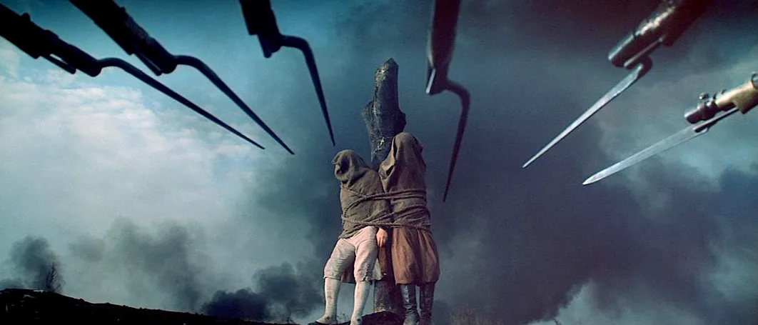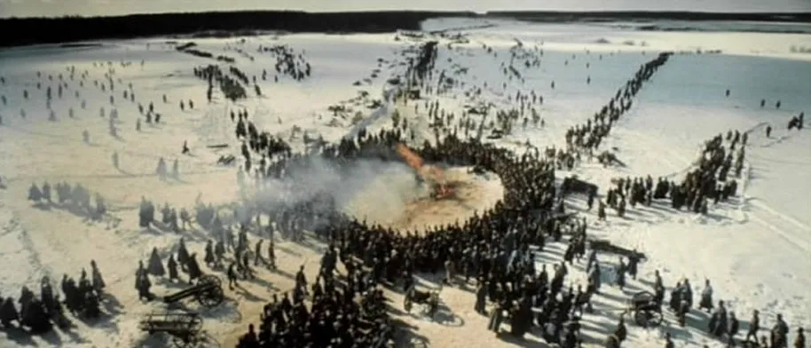 而针对死亡,针对这些面对战争的死亡,影片展现出来的是绝望,不论是普通人还是贵族,当自己的身份从国民变成了俘虏,当自己的家园被一场大火焚毁,所有人都展现出来了一种沮丧到彻底的面容,他们自然无法扭转眼前的一切。且当他们被送上断头台的时候,即使蒙上了双眼,但所有人都展现出来了绝望。