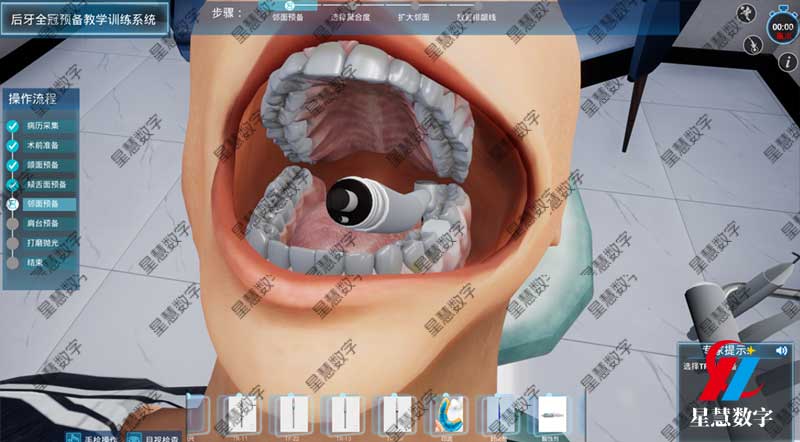 针对后牙全冠预备的特殊性,系统内置了智能引导与实时监测模块。在操作过程中,系统会根据修复体设计要求,预先设定好标准预备量。学生每一步的操作都会被系统捕捉,系统能测量的角度偏差,帮助学生建立正确的空间定位感。