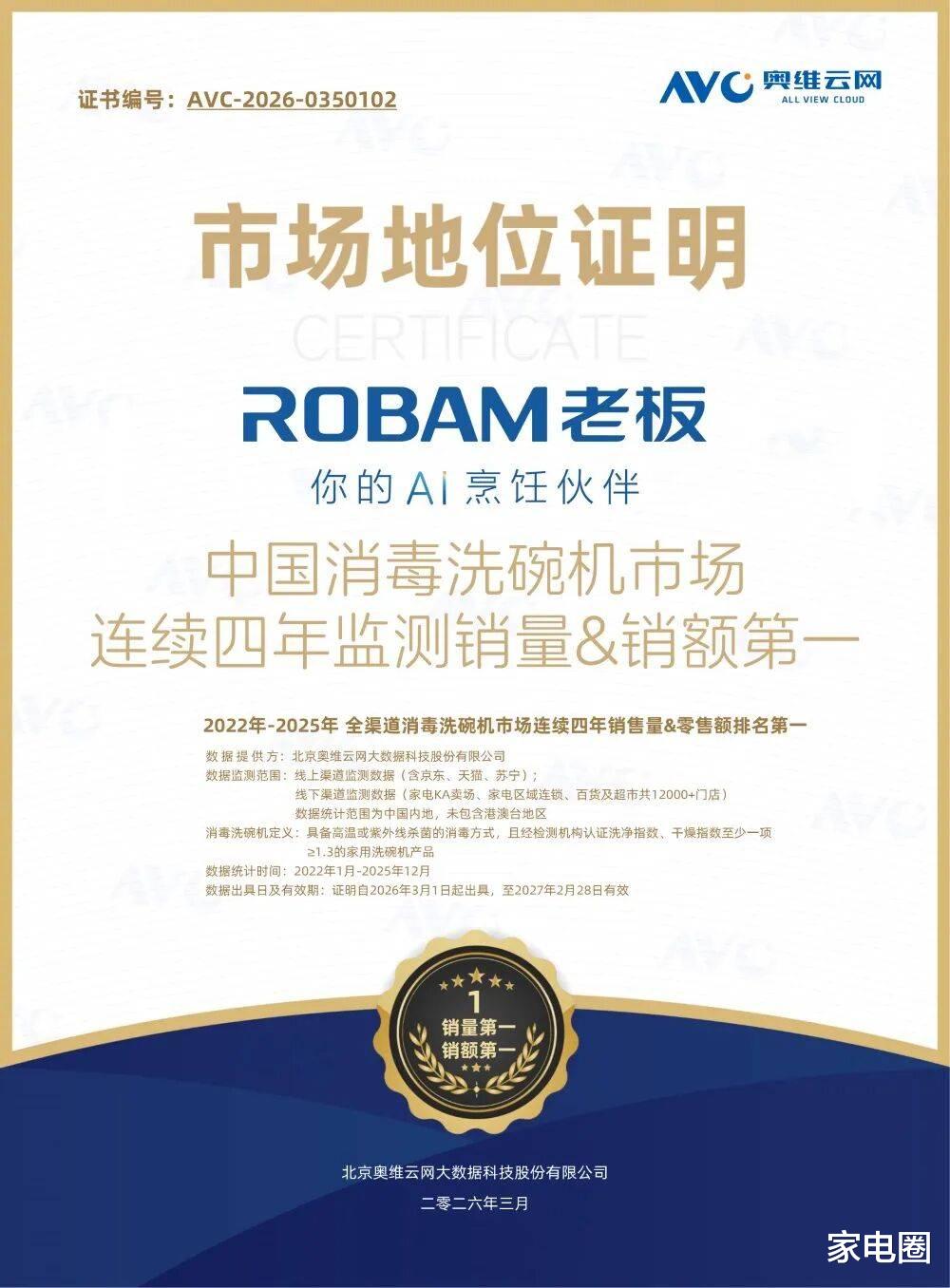 八年深耕、3亿研发投入、500+专利加持、6000万+中国家庭数据支撑,让老板电器在巨头争霸的洗碗机市场,开创了“真消毒”的全新赛道,成为当之无愧的定义者与领跑者。S2 Ultra上市初,就斩获家电业“奥斯卡”之称的2026AWE“艾普兰创新奖”,表彰其在创新、绿色环保和设计上的卓越实力。第三方数据还显示,老板消毒洗碗机已连续四年蝉联全渠道销量、销额双第一,不仅拿下医护级洗碗机认证、0菌认证,消毒效果对标消毒柜二星级标准,更斩获“浙江制造品字标”这一权威标识,彰显了过硬的产品实力。