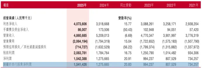 在规模扩张的同时,泸州银行的盈利能力也呈现出“逆势上扬”的态势。在2025年全年,该行实现归母净利润15.41亿元,同比大幅增长20.83%。