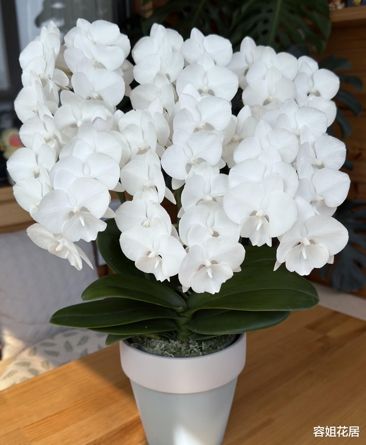 白天鹅蝴蝶兰,开花的时候花朵很大,颜色洁白淡雅,它的花期超长,是公认的花期长的品种。