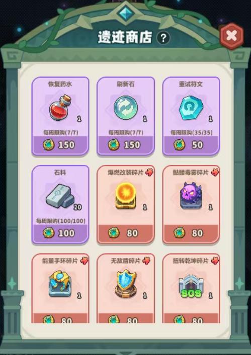 T1 次选:红图腾碎片(100 碎片合成红图腾,全属性 + 8%)、关卡重置券,前者是版本核心战力道具,后者加速刷币进程;
