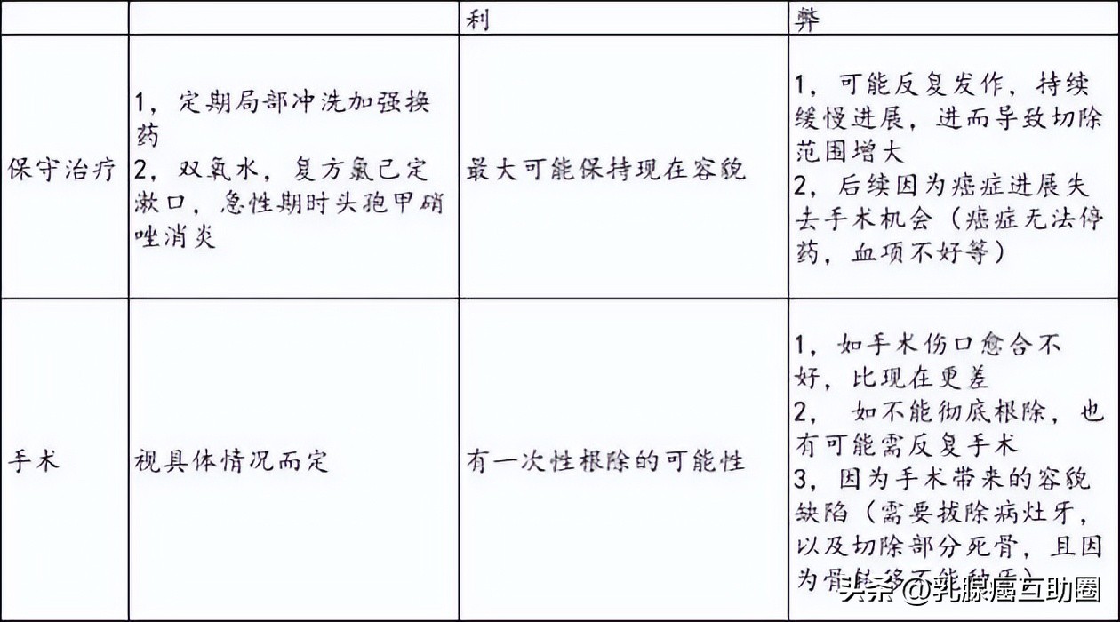 ① 如果手术,首先控制口腔炎症,手术中刮/切除部分死骨,以及拔除局部牙齿,术后流食一段时间。因为大部分坏死病人都有骨转移,种植牙基本不支持,所以拔除牙齿过多,切除范围太大,可能会对容貌造成一定影响。同时,因为各种原因导致,可能会有复发可能,导致再次入院手术。这些都要做好心理预期。