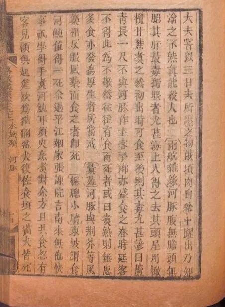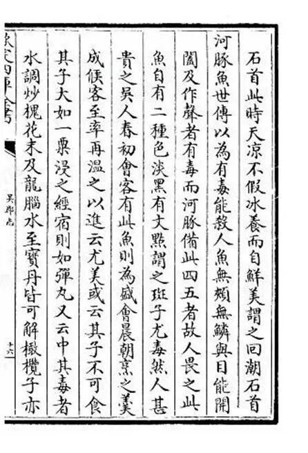 明人李时珍《本草纲目》的集解(据宋人严有翼《艺苑雌黄》)中提到:“河豚,水族之奇味,世传其杀人。余守丹阳、宣城,见土人户户食之。但用菘菜、蒌蒿、荻芽三物煮之,亦未见死者。”(Li Shizhen; Paul U. Unschuld trans.Ben Cao Gang Mu, Volume VIII, Clothes, Utensils, Worms, Insects, Amphibians, Animals with Scales, Animals with Shells.University of California Press, 2021, p.738)。“未见死者”指没有看到谁中了河豚之毒而死。