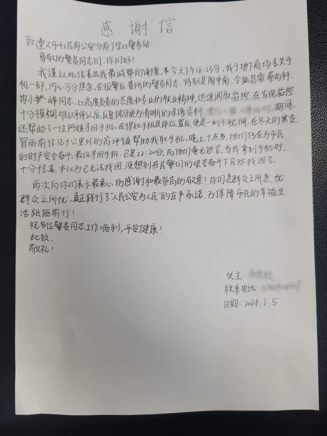 为表达感激,冯女士当场亲笔手写感谢信。信中动情写道:“你们得知手机具体位置后,冒雨驱车前往几十公里外帮我取回手机,一刻也没有耽误。你们急群众之所急,忧群众之所忧,真正践行了‘人民公安为人民’的庄严承诺,为保障市民的幸福生活砥砺前行!”