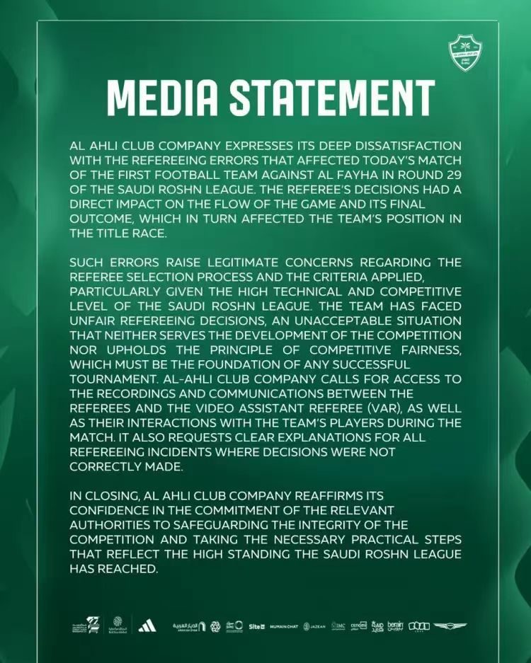 在比赛结束后,吉达国民俱乐部官方发表声明表示,对本轮比赛中出现的误判表示强烈不满,裁判的判罚直接影响了比赛的进程和最终的结果,这也直接影响了吉达国民在联赛冠军争夺战中的位置。该俱乐部更是直言不讳的表示,球队遭遇了不公正裁判的判罚,这种情况是不可接受的,既不利于赛事的发展,也不符合公平竞争的原则。该俱乐部重申了对相关机构维护赛事完整性的信心,并呼吁采取必要的实际措施,以体现沙特联赛所达到的高水准。
