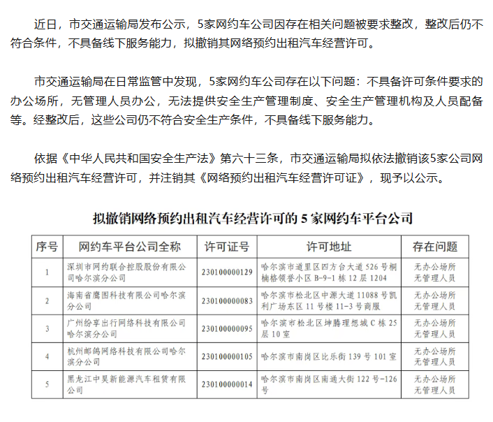近日,哈尔滨市交通运输局发布公示,明确5家网约车公司因整改后仍不符合运营要求,拟被撤销网络预约出租汽车经营许可,这一举措彰显了当地规范网约车行业、保障市民出行安全的坚定决心。
