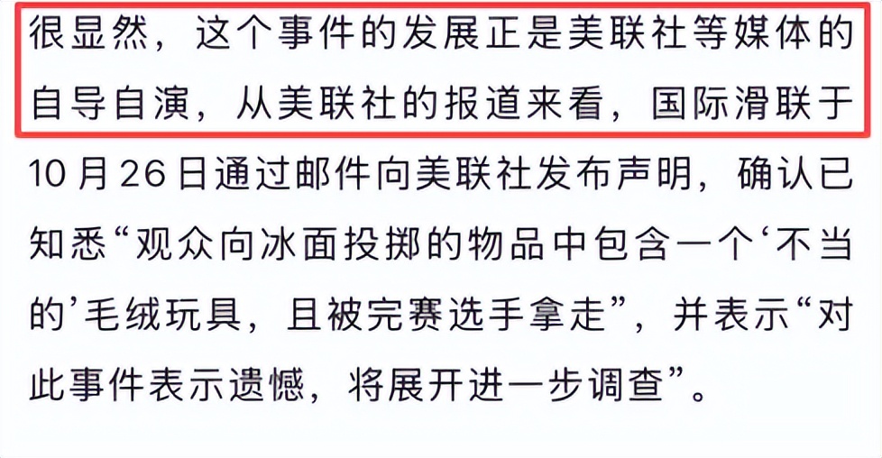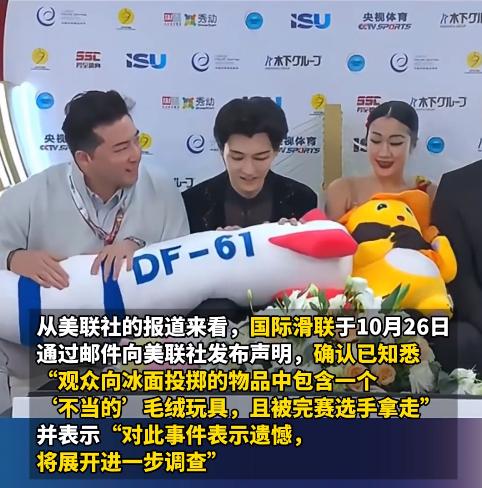 面对排山倒海而来的舆论压力,国际体育组织很快被卷入其中,令人意外的是,国际滑冰联盟的反应异常迅速,事发仅一天后,也就是10月26日,国际滑联就通过一封邮件声明,对事件表达了“遗憾”,直指那个被投掷的物品“不恰当”,并承诺将展开进一步调查。