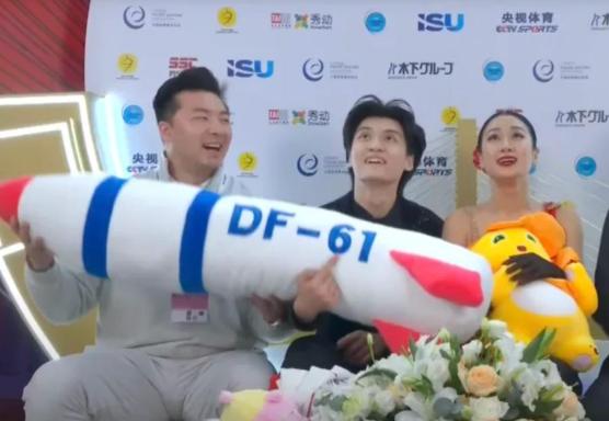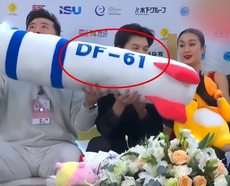 问题就出在它的外形上,这个玩偶并不是寻常的卡通形象,它呈导弹形状,上面还印着“DF-61”的字样,对于现场的运动员来说,在短暂的等分时间里,他们根本来不及,或许也未曾想过去仔细辨认这个粉丝自发投掷的礼物,他们的举动完全是出于礼貌的下意识反应。