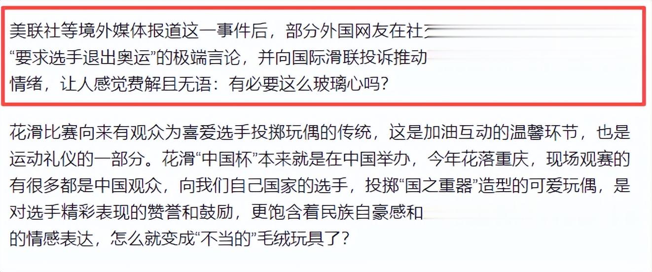 国内网友们也觉得,一个小小的玩偶就让美国破大防了,美国人是真敏感,而且这个玩偶又不是选手自带的,而是观众送的,美国媒体真的是在小题大做!