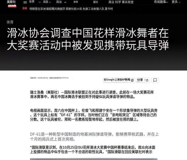 接着美联社紧随其后,不仅引用所谓“匿名评论员”的说法,指控这一行为可能违反了体育保持中立的原则,更直接喊话国际滑冰联盟,要求对此展开调查,英国《卫报》等一众西方媒体也迅速跟进,一场有组织、有预谋的协同报道就此展开。