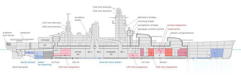 主炮塔全布置于前甲板的方案则参考自英国海军纳尔逊级战列舰,不过纳尔逊级在前甲板共有3座三联装主炮塔,而且因主装甲甲板上的装甲重量限制,使得纳尔逊级的第三座炮塔的高度无法超过第二座炮塔,仅第一座与第二座炮塔采用背负式布局排列,造成第三座炮塔的射角受到限制。