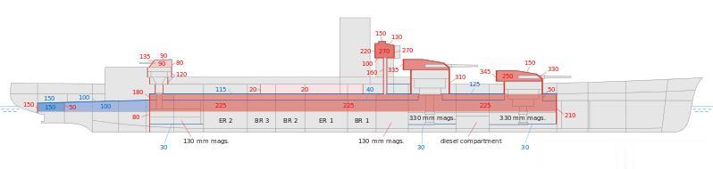 最大燃油容量为4500至5000吨,实战中限制为3700吨(留空舱用作反潜防护)。15节时续航力7850海里,28节时降至2450海里。
