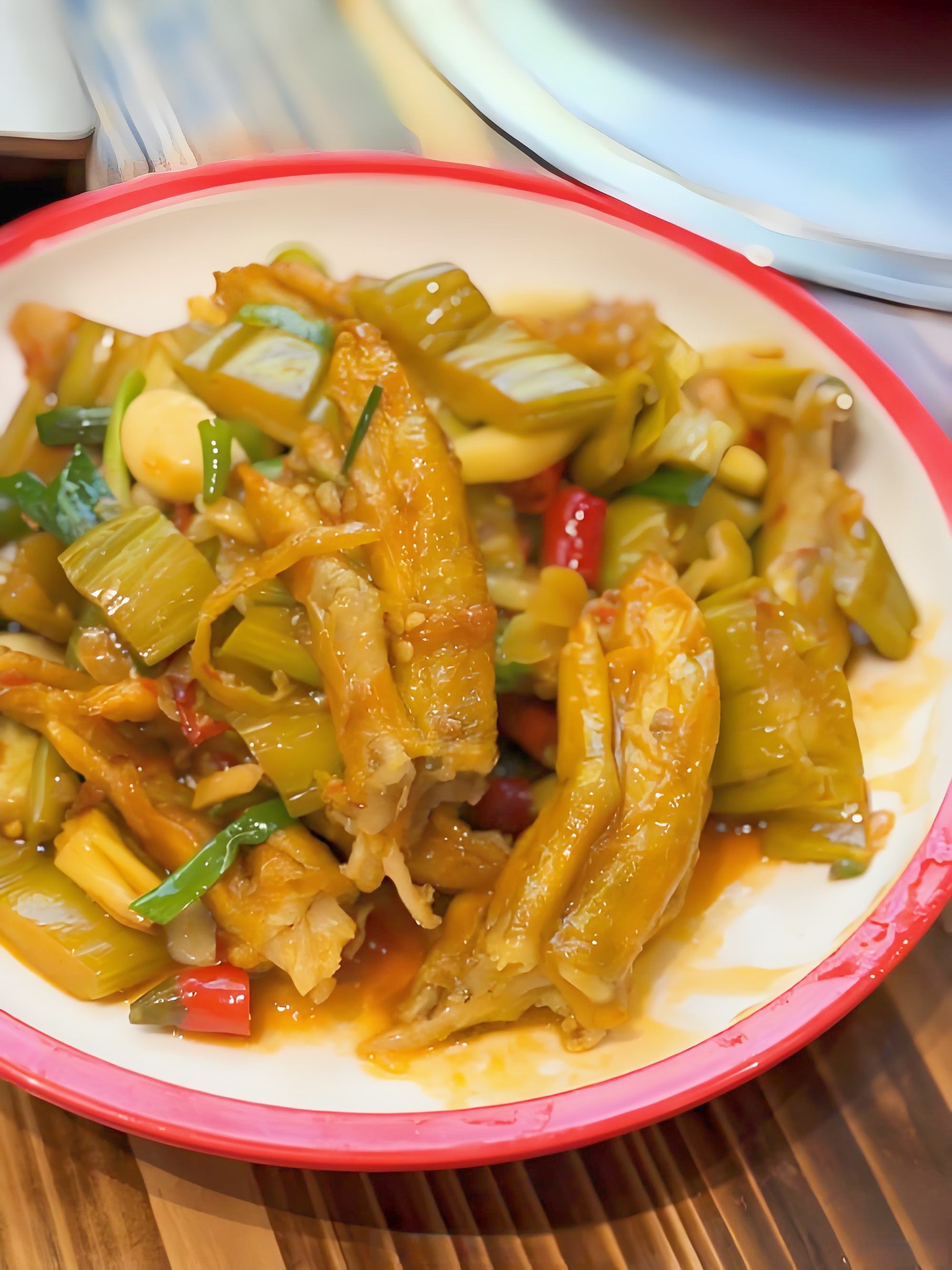 将芋蒙切段,与炸过的鸭脚一同爆炒。芋蒙像海绵一样,能吸收鸭脚的肉香和汤汁的酸辣味。这道菜虽然没有汤煲那么汁水丰盈,但锅气十足。鸭脚软韧,芋蒙脆嫩,酸辣入味,是柳州人家里最常见、也最下饭的一道家常美味。