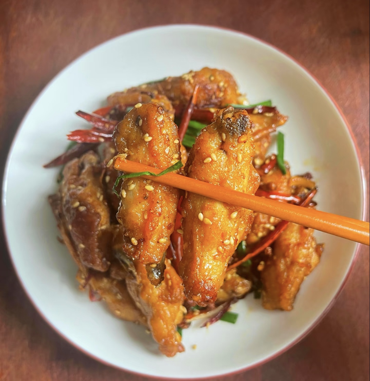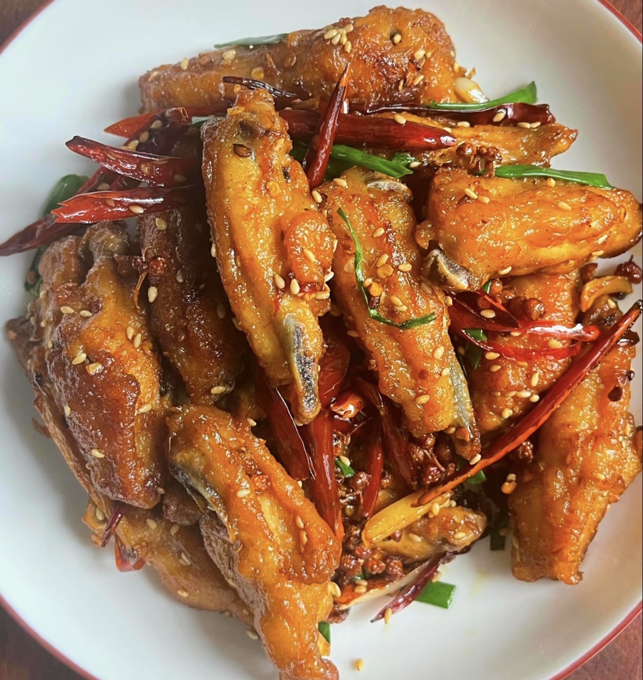最后一步就是点睛之笔了,往锅里撒上一把孜然粉、一把熟白芝麻,再把切好的葱段倒进去,开大火快速翻炒十几秒,让葱段的清香、孜然的焦香、芝麻的醇香完全融入鸡翅里,就可以关火出锅了。刚出锅的干煸鸡翅,色泽红亮诱人,香气扑鼻,每一块鸡翅都裹满了辣椒、花椒和芝麻,咬一口,外皮酥脆,内里的鸡肉鲜嫩多汁,麻、辣、鲜、香、甜在嘴里层层绽放,越嚼越香,让人根本停不下来。
