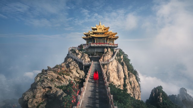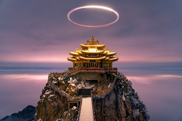 精准的气候前提:必须是雨后初晴的傍晚,确保空气湿度饱和,且山谷与山顶存在较大温差,促使水汽冷凝成雾。独特的地形导演:老君山主峰如“凸起的尖帽”,独特地形会迫使气流改变方向、形成涡旋,为云雾“定形”创造了物理基础。绝妙的气流切割:最关键的是,山顶与山腰常存在不同方向的气流层。这两股气流之间形成的无形“空气屏障”,像一把利刃,将上升的云雾精准切割、塑造成环形。黄金的光影渲染:时间必须卡在日暮将至、华灯初上的刹那。建筑灯光与夕阳余晖共同作用,通过“丁达尔效应”穿透云雾微粒,才能渲染出那圈决定性的、充满神迹感的“金边”。“有时灯亮了雾没来,有时雾来了灯没亮,还有时雾飘到了别的山头。”魏暐解释道。无人机起飞时机、风力风速的稳定,任何一个变量出错,都无法成就这完美一幕。
