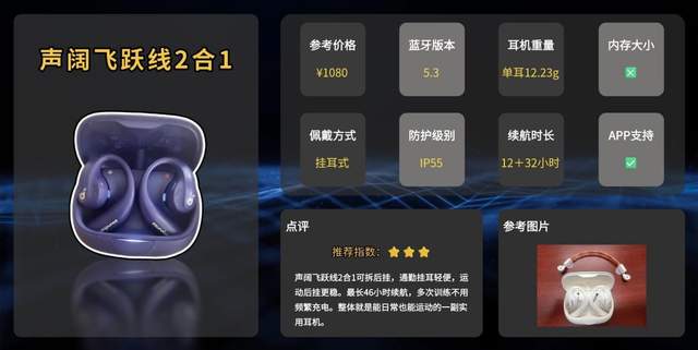 声阔在蓝牙耳机市场走主流大众路线,强调声音技术与续航体验;在运动耳机防汗、防水研究上投入较多;飞跃线2合1在声阔产品线中定位为多场景运动/日常混合使用款。