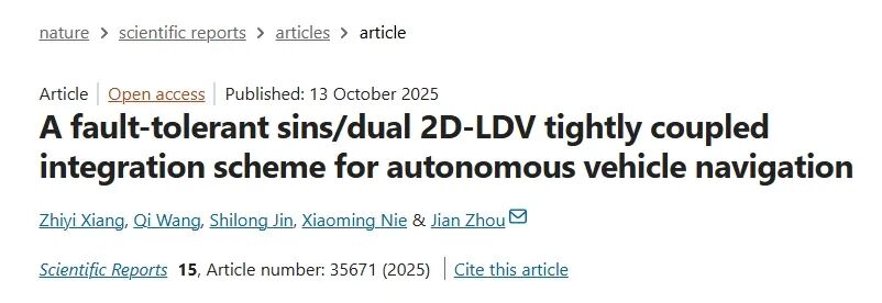 10月13日,国防科技大学周健团队在Scientific Reports(科学报告)上发表题为A fault-tolerant sins/dual 2D-LDV tightly coupled integration scheme for autonomous vehicle navigation(一种用于自动驾驶车辆导航的故障容忍SINS/双2D-LDV紧耦合集成方案)的论文,提出了一种新型车载自主导航技术,能够在卫星信号失效的复杂环境中实现高精度、高可靠性的定位。这项研究为解决自动驾驶在隧道、城市峡谷等场景中的"失位"难题提供了创新方案。