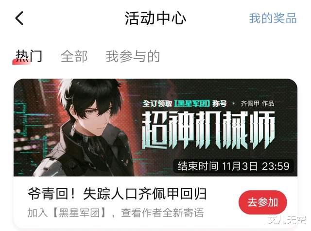 宣传语还是“失踪人口齐佩甲回归”,也不知道是不是他最近要回来开新书了,还是要续上断更了三年三个月的《星界使徒》,亦或者就是一个活动噱头?