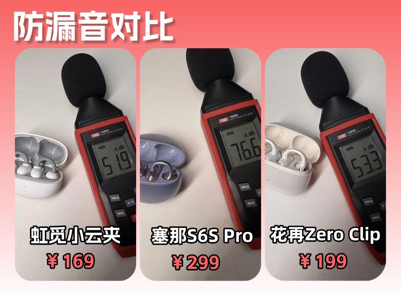 防漏音方面,虹觅 Air2 小云夹做得最好。它有自研的防漏音模式,按三次按键就能开启,据说能通过反向声波抵消漏出的声音。我测试的时候把音量开到一半,旁边的人几乎听不到声音,就算在安静的办公室用,也不用担心打扰到同事。花再 ZeroClip 和塞那 S6S Pro虽然也有基础的防漏音处理,但效果差了点,在安静环境下,旁边的人可能会隐约听到一点声音,不过把音量调小些,情况会好很多。