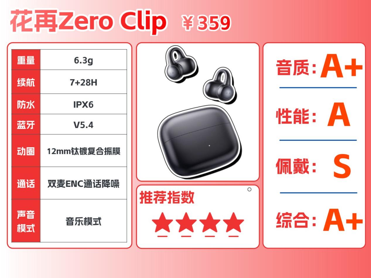 要是你更看重日常使用省心,花再 ZeroClip 可以考虑。359 元的价格,佩戴起来轻盈不压耳,音质均衡清晰,防水等级也高,经常在户外用耳机,或者容易不小心把耳机弄湿的人,选它挺合适。