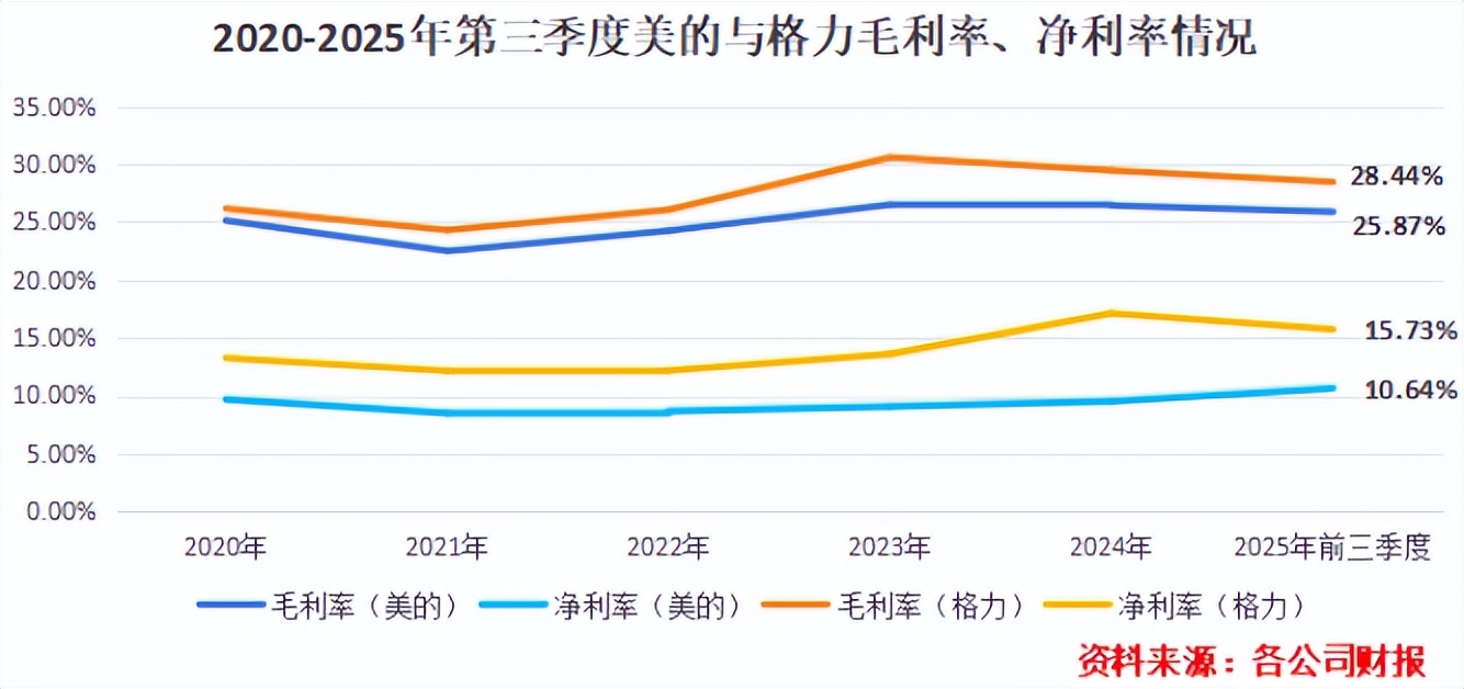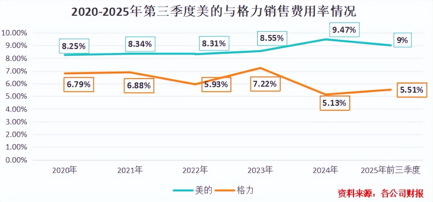 2020-2025年前三季度,美的销售费用率一直在8%以上,目前已经到9%;而反观格力,目前一直在5%附近徘徊。