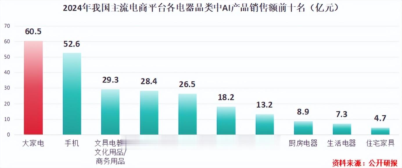 机构统计,2024年,我国主流电商平台中AI产品销售额前十名中,“大家电”以60.5亿元排名第一。AI类家电市场规模越来越大,美的已把电商的路铺好,可谓做足了准备。