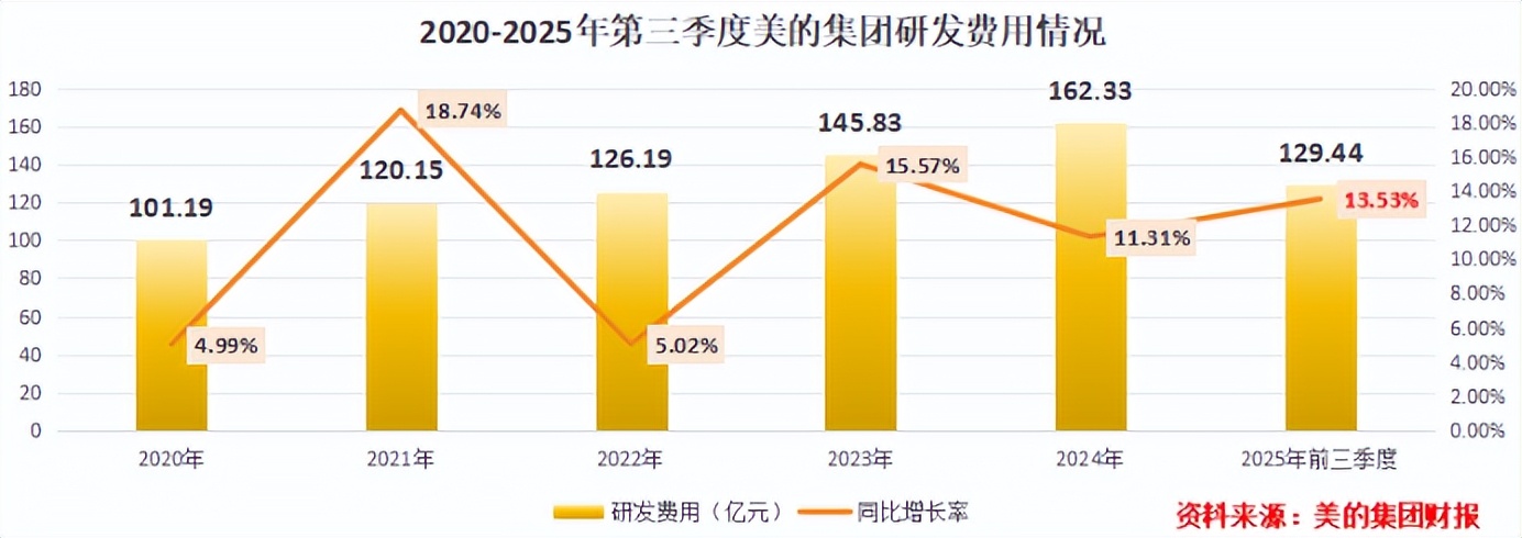 2020-2025年第三季度,美的研发费用一直保持同比增长,历年研发费用都超过100亿元。2025年前三季度,其研发费用更是同比增长13.53%,达到129.44亿元。