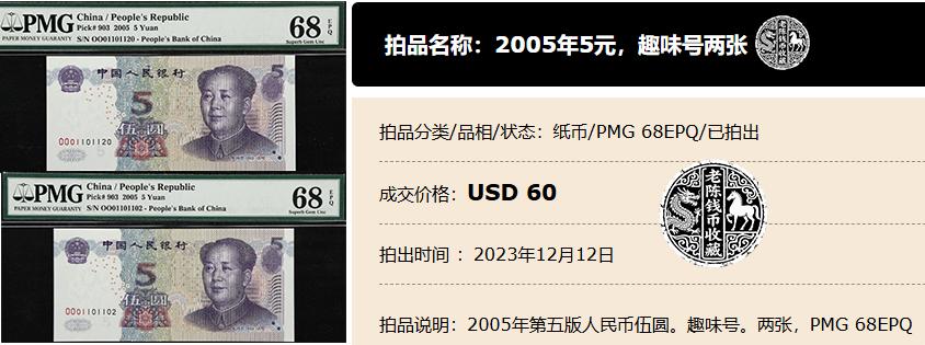 像上面这两张2005年的5元,两张一起拍出了60美元,折算下来,差不多422元。