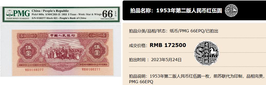 咱们开头说的那张高价值的5元纸币,也就是上面这张66分的“红五元”评级币,在之前的拍卖会中,以17.25万元的价格被拍出 。