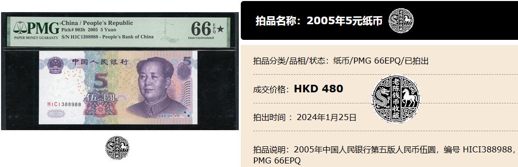 比如下面这张66分并且还带着“黑星”标的05年评级纸币,之前在拍卖会上就以480港币成交了。