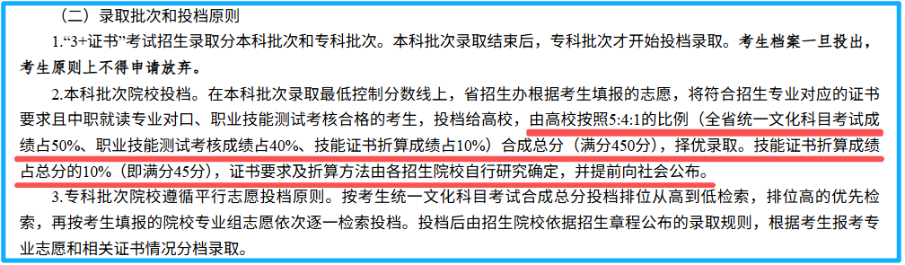 3+证书考试本科批次合成总分(满分450分)=语数英成绩x50%+职业技能测试考核成绩×40%+专业技能课程证书(或职业资格证书)考试等级对应成绩×10%
