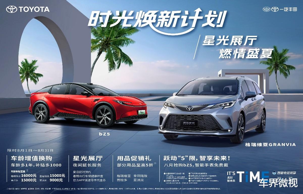 为回馈用户厚爱,上半年,一汽丰田推出了极具诚意的“时光焕新计划”,立足用户购车和用车的全周期,以车龄增加一年补贴增加1000元的“车龄增值补贴”机制,彻底消除用户的里程焦虑。8月份,一汽丰田真诚又加码,车龄增值换购至高补贴16000元;星光展厅夜间延长服务,避开酷暑轻松看车服务更从容;格瑞维亚、普拉多、皇冠陆放、亚洲龙部分用品至高5折;8月抢购全新bZ5还有智能手表免费戴。