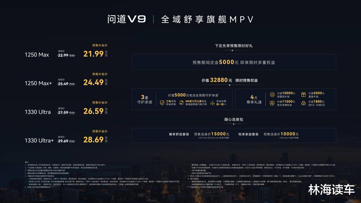 4月28日,这款承载“高端平权”使命的旗舰车型正式开启预售,预售补贴价为21.99万元-28.69万元,轻松解锁十大旗舰配置。值得注意的是,即日起下定问道V9,用户可享包含“三电系统终身质保、8年或15万公里电池衰减超限值只换不修、电池自燃烧一赔一”的3重守护承诺,以及价值10000元购置税补贴、价值5000元置换补贴、价值11000元用车保障权益、价值1880元先见·问道礼的四大尊享礼遇,限时预售权益总价值至高32880元,让消费者无需为产品溢价买单,直接坐拥全域舒享的豪华出行体验。