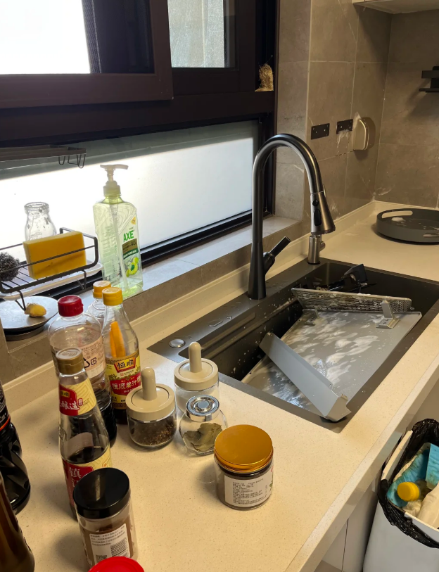 有一次家里来了十几口人,聚会后厨房简直像“战场”。