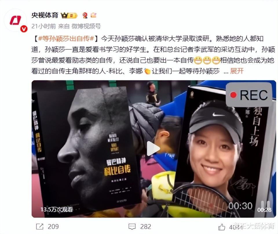 更让球迷们期待的是,孙颖莎还有望在未来出一本个人的自传,这更是让粉丝们感到无比的期待。近日,央视体育在社交媒体上透露,孙颖莎平时很喜欢看自传类的励志书籍,她也很期待自己取得成功以后也出一本自传。就像孙颖莎喜欢的那些体育明星科比、李娜那样。