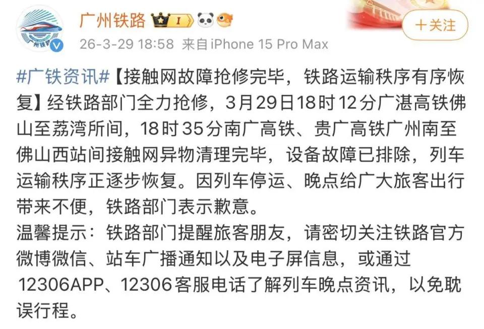 铁路部门的回应面对舆论,“广州铁路”很快发了通报,确认是受强降雨和龙卷风影响,导致接触网挂了异物,造成了故障。在抢修完成后,也发文对晚点致歉 。