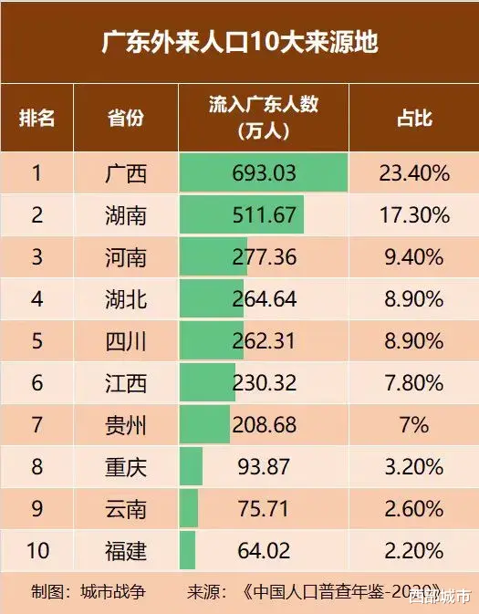 “七普”数据显示,广东的省外流入人口达到2962.21万人。其中,湖南人仅次于广西,位居第二,总量超过500万。