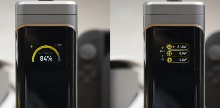开箱第一眼,它没急着炫耀功率。黑黄配色的家族包装,打开,一块半透磨砂面板嵌着TFT彩屏,屏幕亮起时像启动了一台微型舰桥。按键在左侧,拨一下,功率、电压、剩余电量轮番切换。