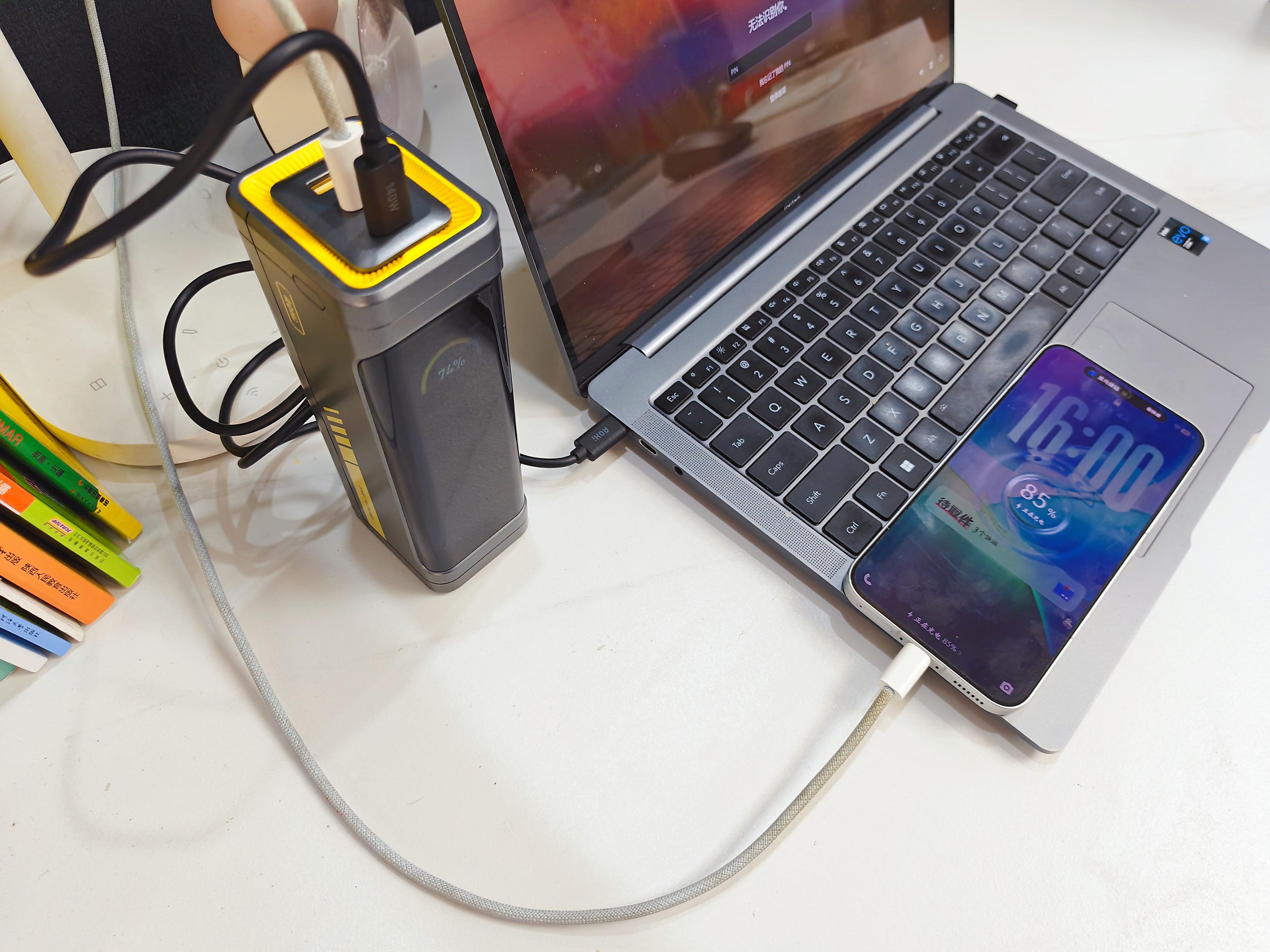C1 140W,C2 140W,A口还能再给手机充电。不得不是310W太强了,即使是三台设备也可以同时满速跑,功率分配纹丝不乱。市面上号称“多口快充”的产品不少,但大多是单口140W撑门面,双口一插立刻掉速。