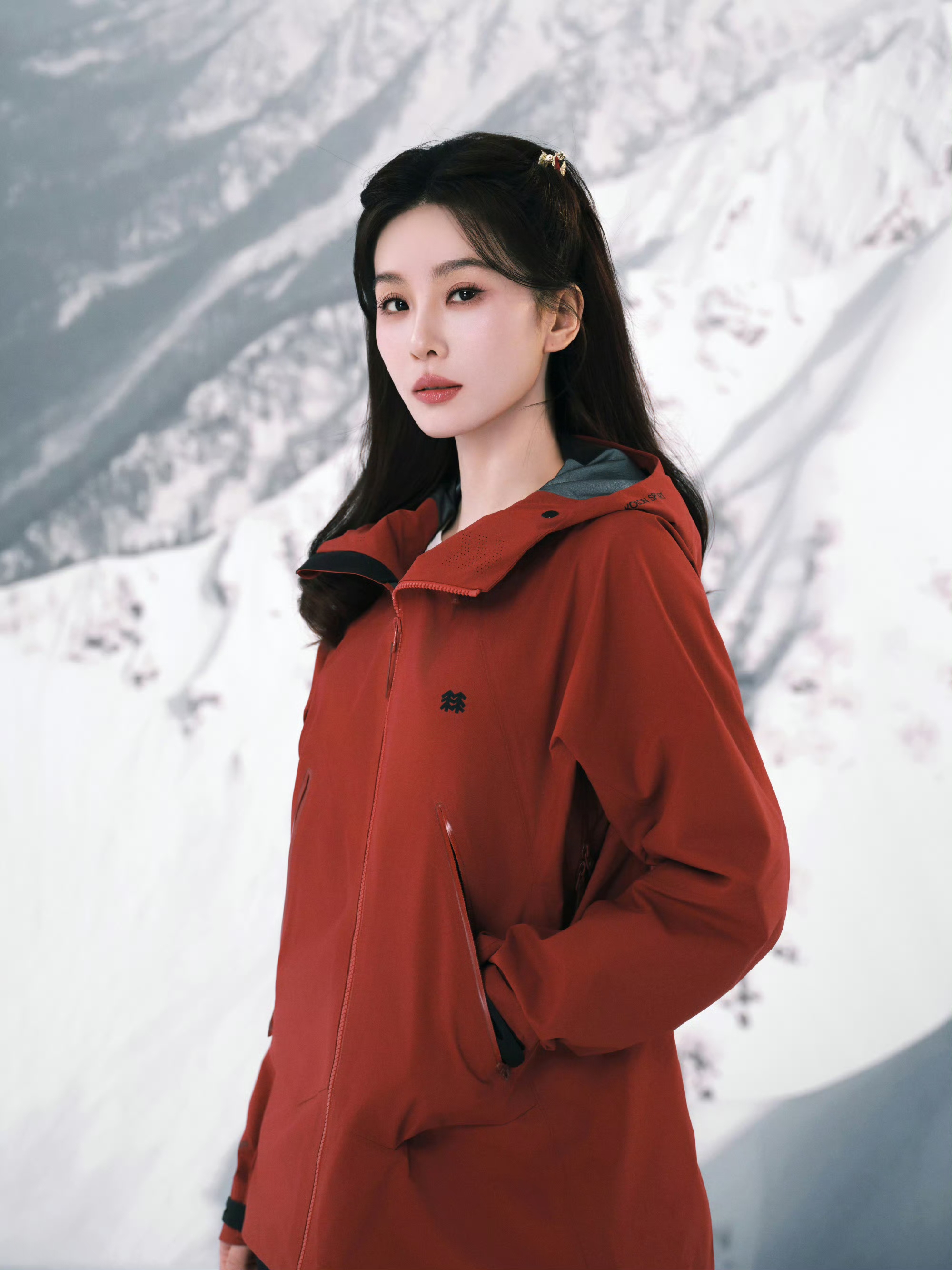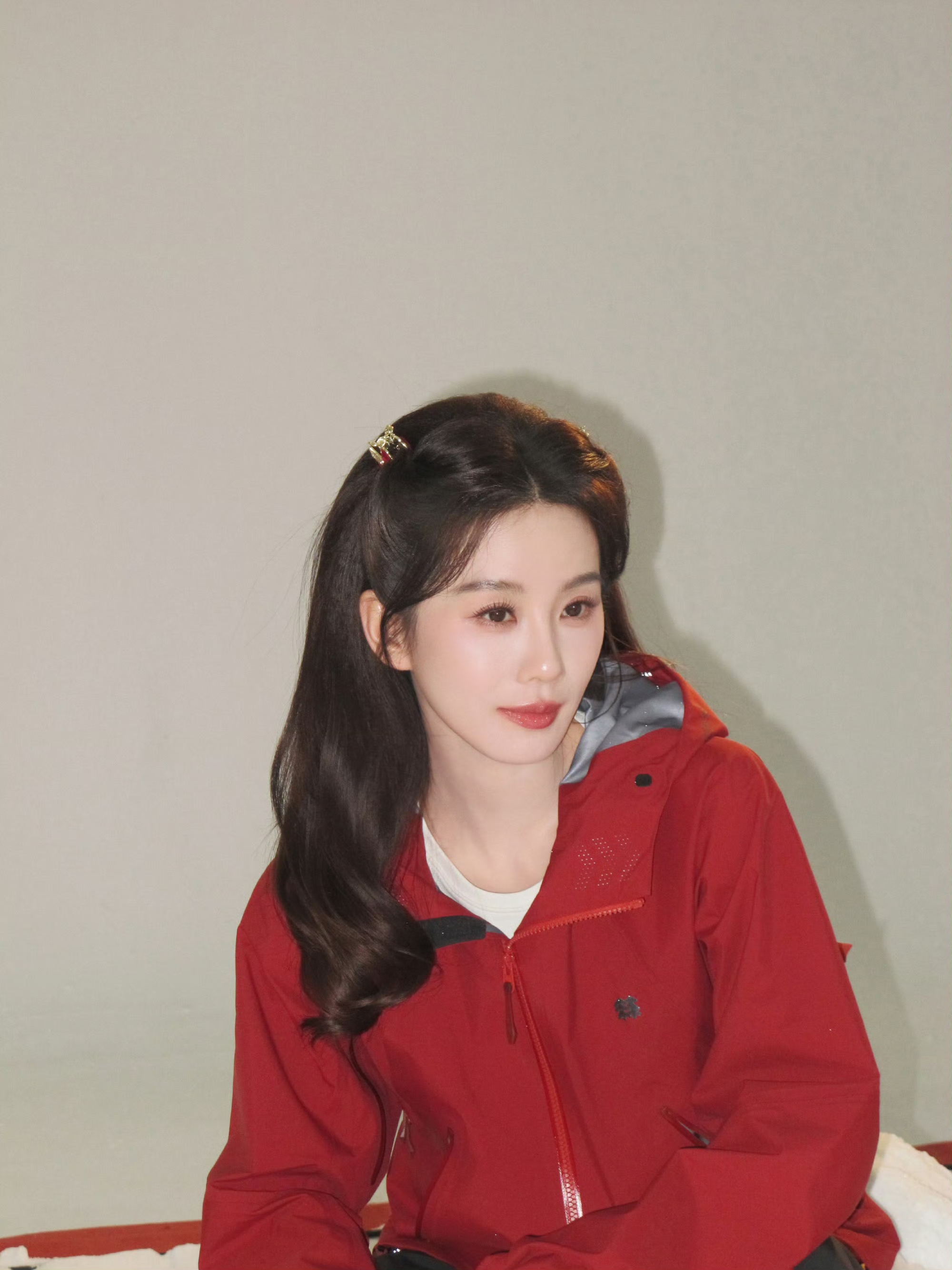 在雪山布景中解锁红色冲锋衣造型,明艳的色彩与皑皑白雪形成强烈反差,瞬间打破清冷氛围。半扎发型简约清爽,为整体造型增添了几分灵动与率性。