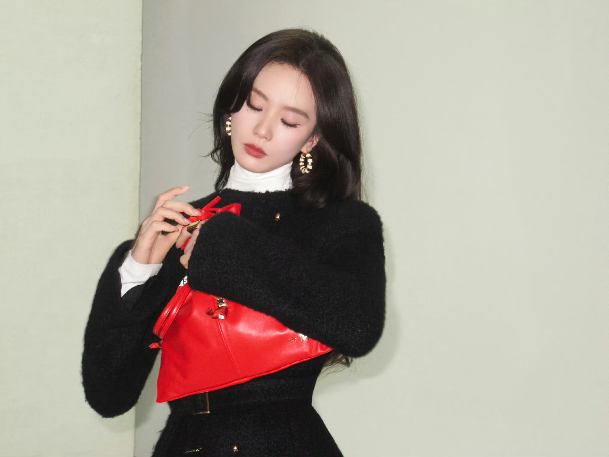 蓬松长发衬得五官愈发精致,冷冽眼神直视镜头,搭配金色配饰与红色包包,既有职场女性的干练,又不失骨子里的优雅,将大女主的飒爽与大气完美拿捏。