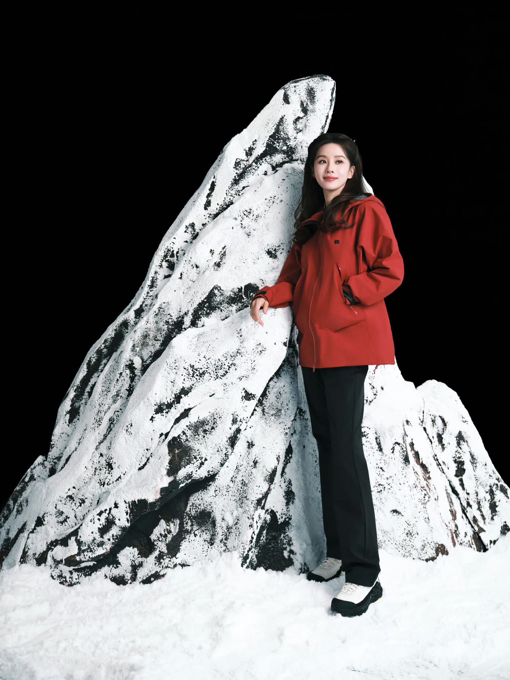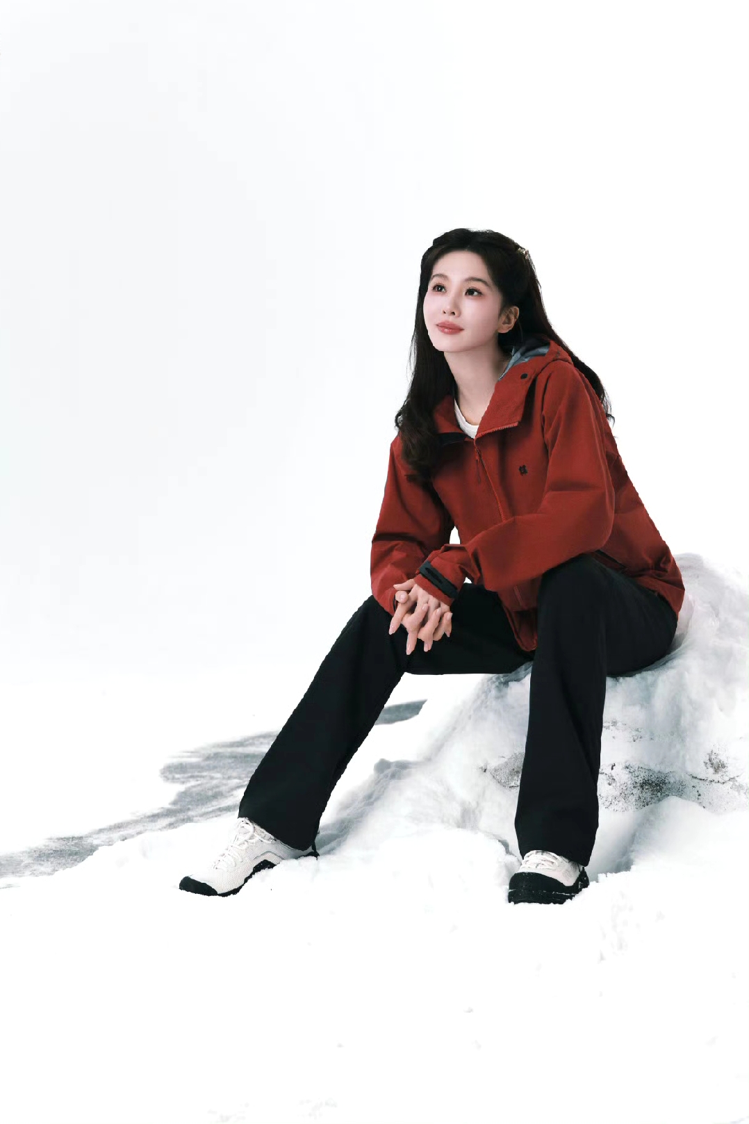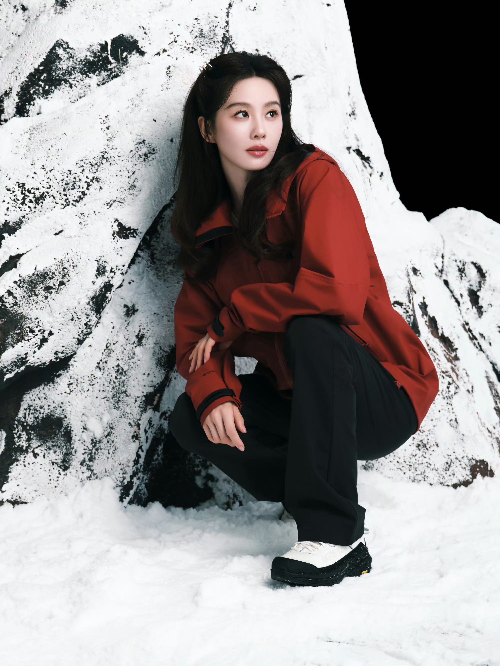 蹲踞在雪地岩石间的姿态松弛舒展,为她骨子里的清冷气质,注入了运动风独有的活力与洒脱。热烈的红与清冽的白相映成趣,将风格无界的魅力展现得淋漓尽致。