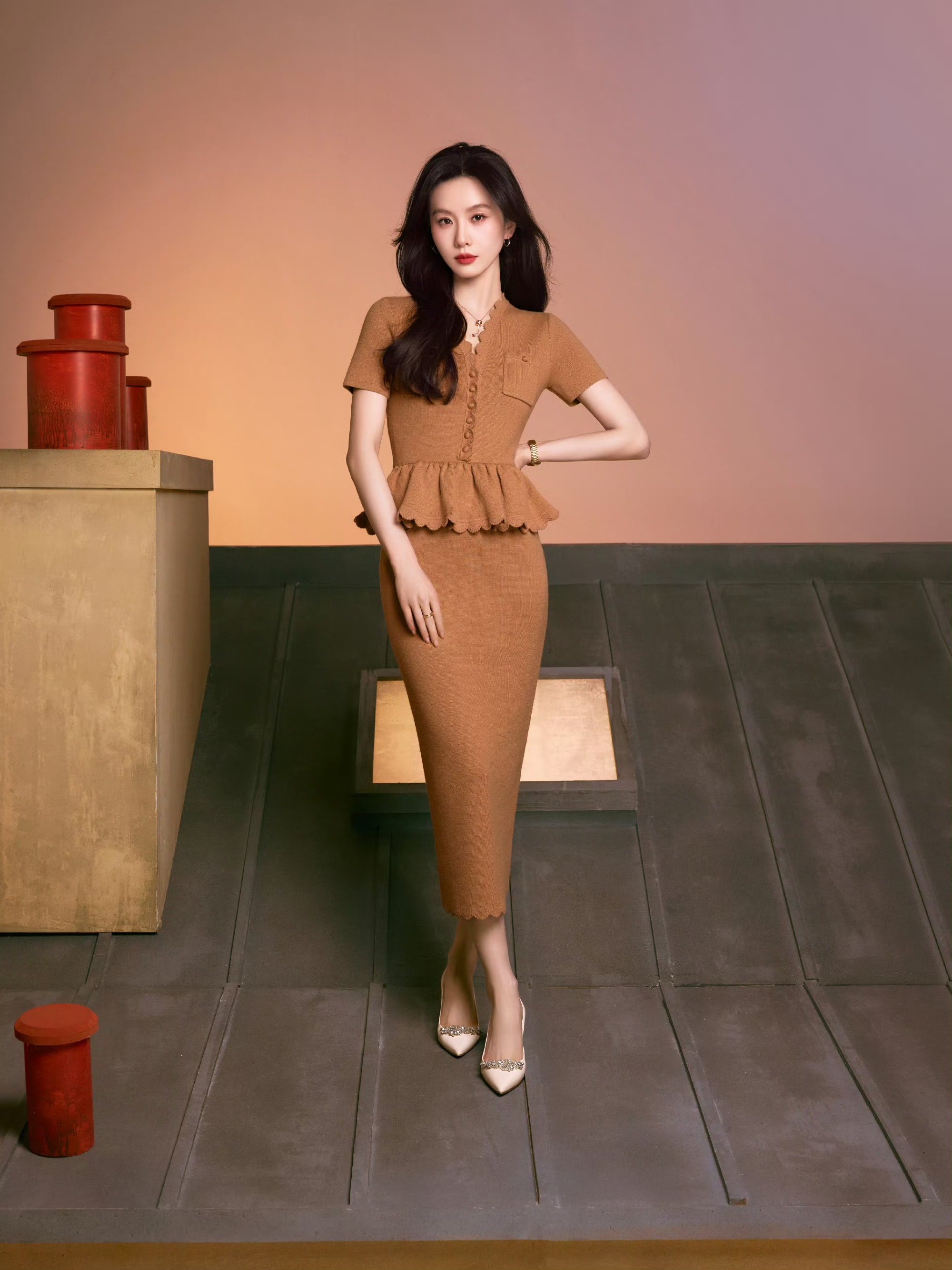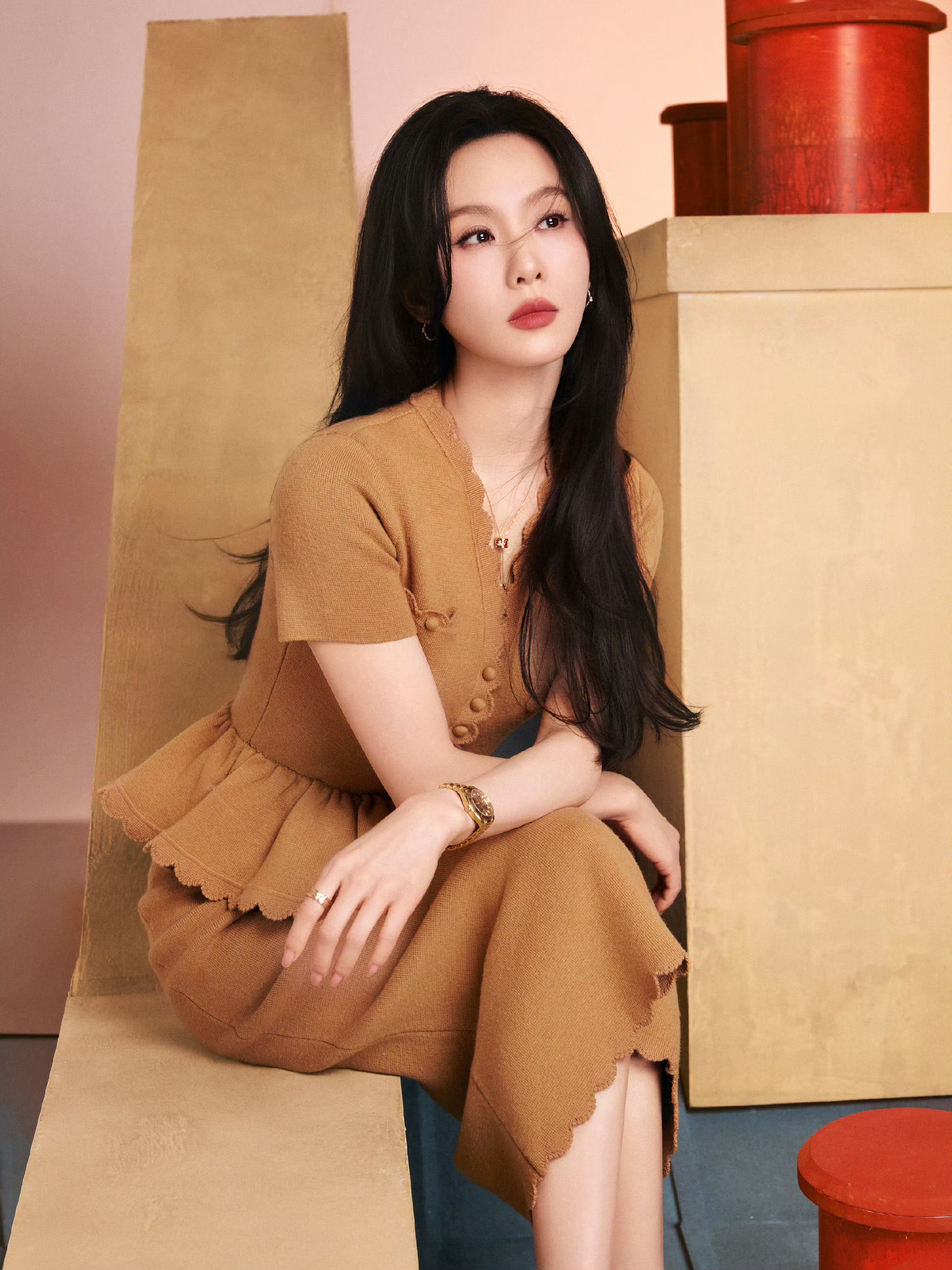 刘诗诗身着驼色针织收腰套装,V领花边设计勾勒出柔美的肩颈线条,修身包臀裙尽显曼妙身姿。乌黑长发自然垂落,抬手轻扶金鱼风筝的姿态灵动又温婉。