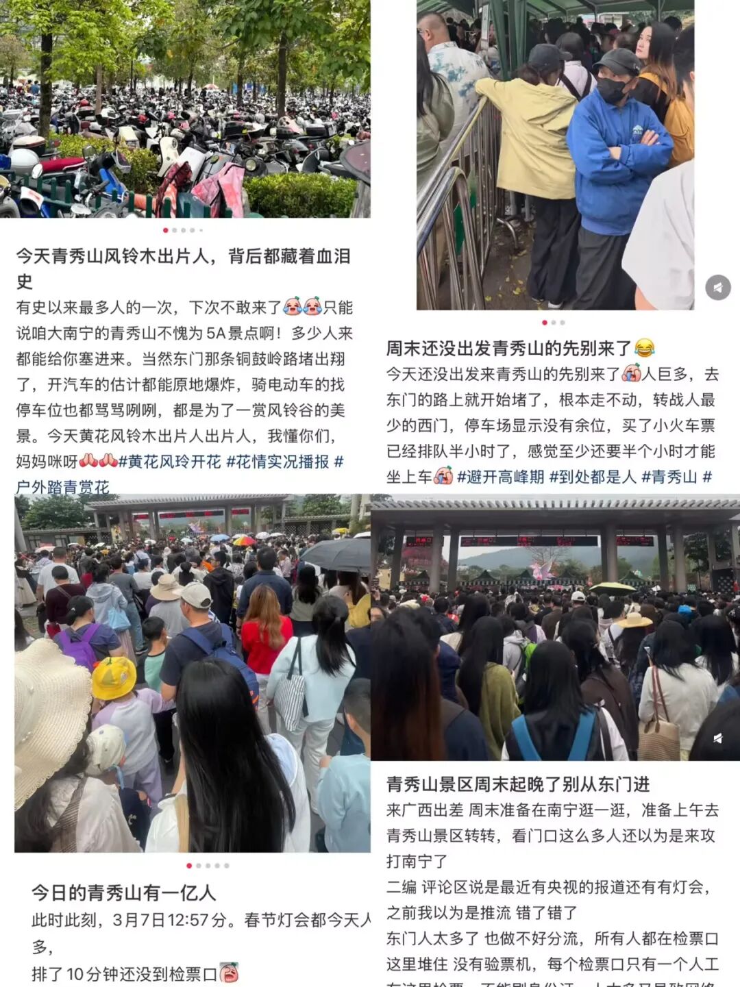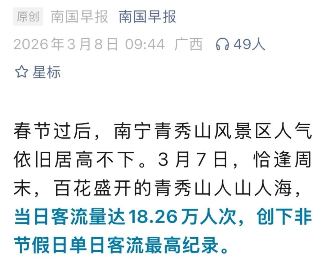 春节人多是黄金假期的「常规操作」,不奇怪。但3月7日,一个普普通通的周六,却有18.26万人挤进了青秀山。