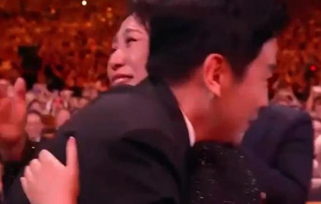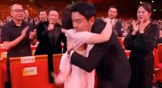 当主持人宣布影帝结果后,先是坐在他身旁的赵丽颖起身给了雷佳音一个拥抱。