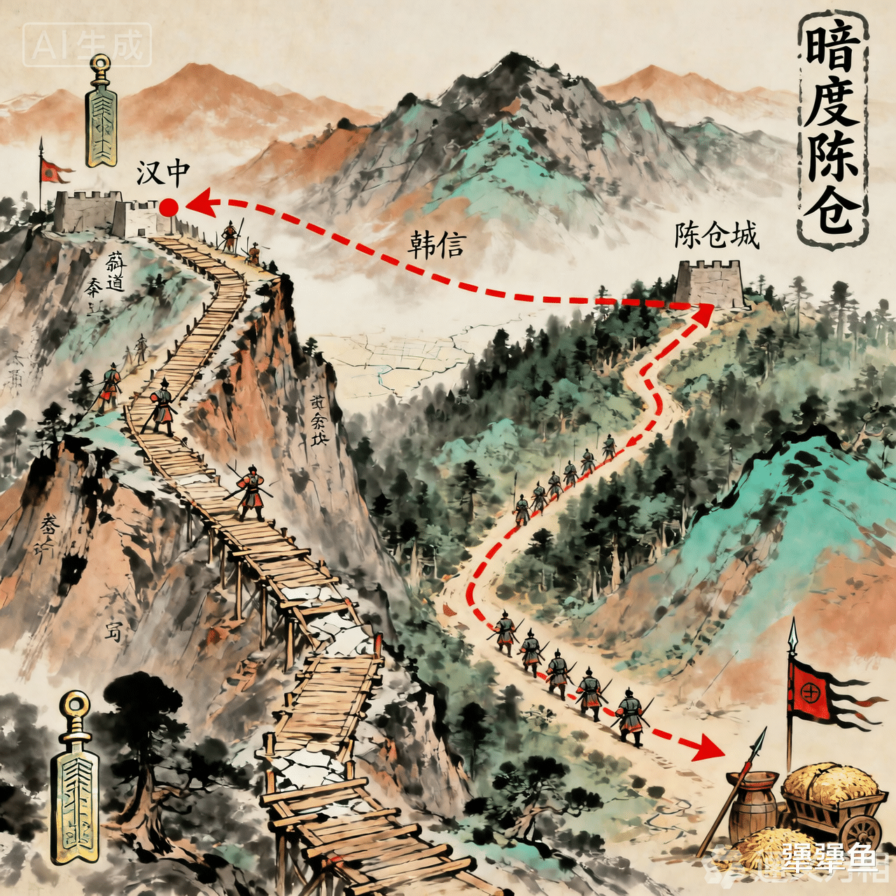 🗡️ 第二幕:暗度陈仓——最危险的地方,就是最安全的路被贬汉中,栈道烧毁,天下以为刘邦完了。但他悄悄启用一个“逃兵”——韩信。韩信说:“章邯等人,秦人恨之入骨。三秦之地,传檄可定!”