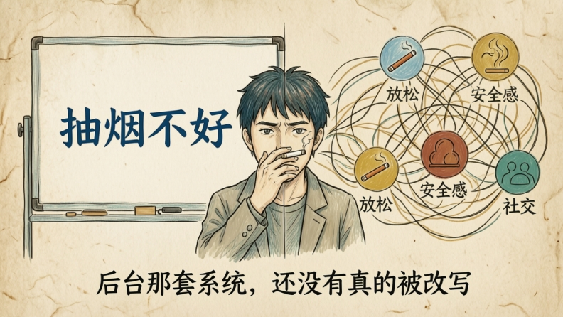你知道抽烟不好,但无意识把烟和放松、安全感、社交绑在了一起。你知道自己不该总逃避,但一进入关键场景,羞耻和恐惧就自动接管。你知道某段关系在耗你,可你的旧模式还是会让你不断回去解释、迎合、妥协。这时候,不要急着把问题全归结为意志薄弱。很多时候,不是你不想改变,而是后台那套系统,还没有真的被改写。